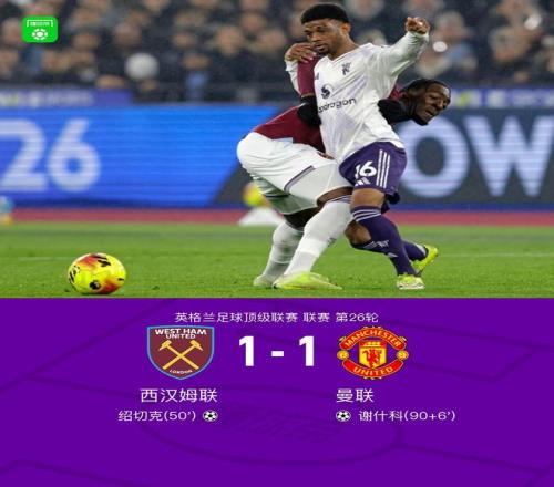 北京時間2月11日英格蘭足球頂級聯(lián)賽 聯(lián)賽 第26輪,西漢姆聯(lián)主場對陣曼聯(lián)。西漢姆聯(lián)紹切克破門。曼聯(lián)謝什科破門。最終比分西漢姆聯(lián) 1-1 曼聯(lián)。