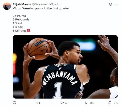 首節(jié)7分59秒,9中8,三分4中3,罰球8中6,拿到25分3籃板1搶斷1蓋帽,命中率88.9%,三分命中率75%,真實命中率99.8%,正負值+13,文班亞馬這個天賦真是炸裂異常。