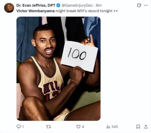 洛杉磯的醫(yī)學專家埃文-杰弗里斯:這個夜晚的文班亞馬就是張伯倫降臨。