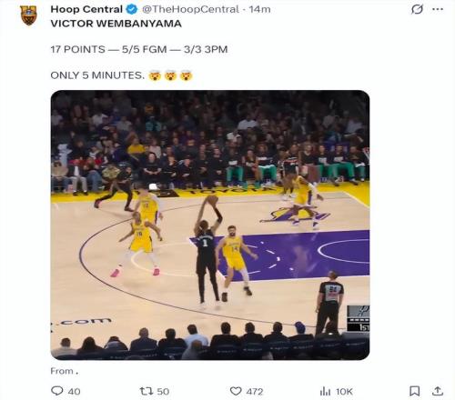 開場文班亞馬短短5分鐘里就5中5,三分3中3,拿到17分,克勒貝爾在文班亞馬的身前像個小學生,文班亞馬一人就錘爆了湖人全隊。