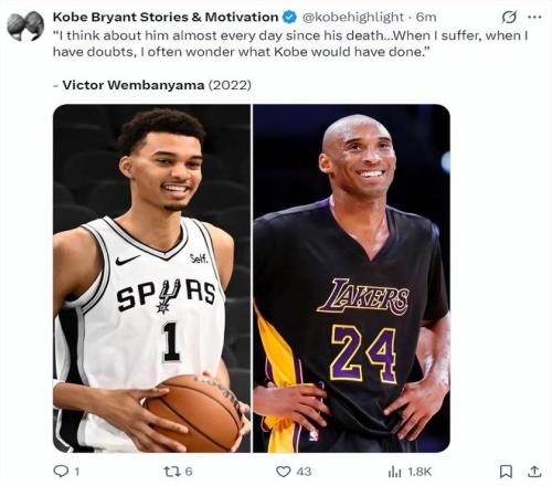 科比的球迷組織回憶了文班亞馬2022年悼念科比的言論:自從科比去世后我?guī)缀趺刻於紩肫鹚?。當我遭遇困難、產生疑慮時我經(jīng)常會思考科比是怎么去做的。