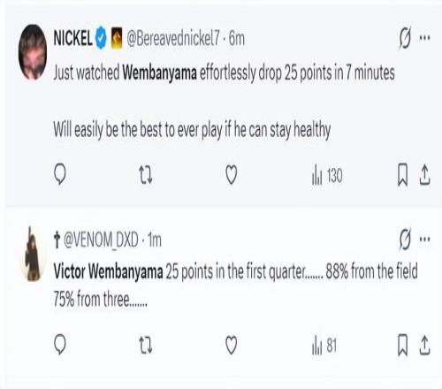 文班亞馬直接登上了全美第一熱搜,Wemby這個天賦實在是太恐怖了,外線三分干拔,持球歐洲步暴扣,空接暴扣,湖人這些飲水機球員在天賦上被各種碾壓。