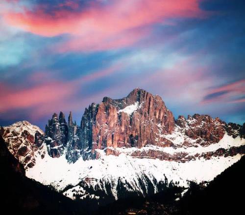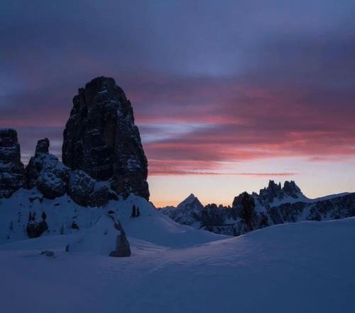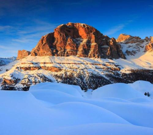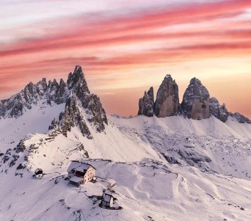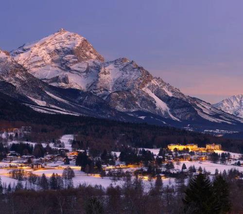理解科爾蒂納為何成為滑雪圣地,必須從認(rèn)識多洛米蒂開始。這片山脈以18世紀(jì)法國地質(zhì)學(xué)家德奧達(dá)·德·多洛米厄命名,其獨特的白云巖構(gòu)成了它標(biāo)志性的淺色肌理,在日光下宛如“蒼白山脈”。然而,自然的魔法在晨昏上演:當(dāng)太陽光線低角度掠過,整片山體會被瞬間“點燃”,從柔和的粉金色漸變?yōu)闊肓业幕鸺t。這場每日兩次的光影戲劇,被當(dāng)?shù)厝朔Q為 “Enrosadira”,阿爾卑斯夕照,也讓這里的每一次滑行,都能邂逅粉金霞光相伴的浪漫。