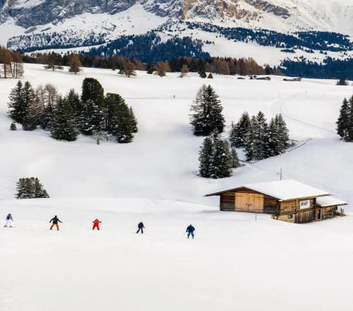 最令人心動的是,這條雪道的終點直接銜接高山木屋Rifugio Scoiattoli,省去了趕路的煩惱,實現(xiàn)了滑雪與Aprés-ski的無縫銜接。滑完雪,無需長途跋涉,只需幾步便能走進(jìn)溫暖的木屋。坐在露臺的長椅上,脫下滑雪靴,換上舒適的拖鞋,點一份炭烤野豬肉,搭配一杯醇厚的特倫蒂諾紅酒,眼前是五塔山的壯麗全景,耳邊是風(fēng)雪掠過松林的輕響,那種松弛與愜意,正是科爾蒂納獨有的度假美學(xué)。