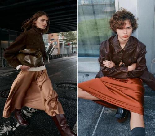 之前也聊過,帥氣利落的麂皮/皮革夾克,能很好地化解緞面裙的隆重感。而且,“橙+棕”本來就是相近色,組合起來很像落日余暉。