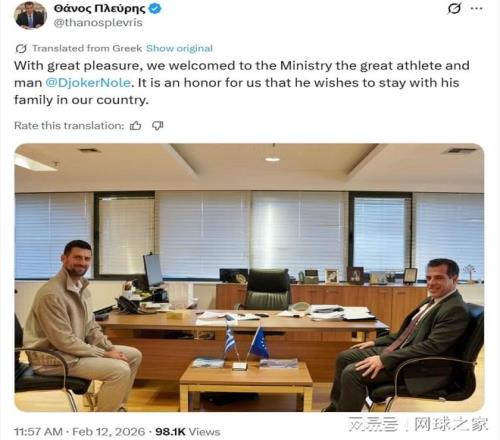 周四,希臘移民與庇護(hù)部長(zhǎng)Thanos Plevris在X(原Twitter)上發(fā)文稱,德約科維奇“希望與家人留在我們國(guó)家”,并分享了自己與這位塞爾維亞球星合影的照片,“我們非常高興在部里歡迎這位偉大的運(yùn)動(dòng)員和杰出的人,他希望與家人留在我們國(guó)家,這對(duì)我們來(lái)說(shuō)是一種榮幸?!?/p>