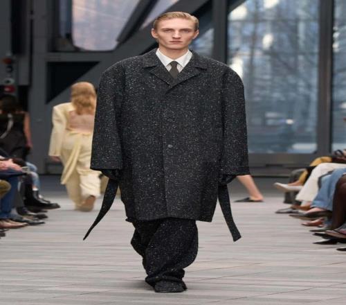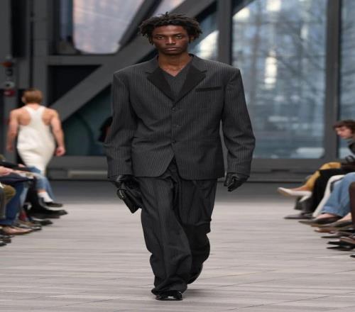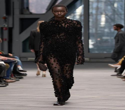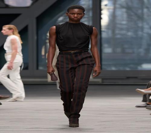 系列開場(chǎng)由黑白簡(jiǎn)約的服飾引領(lǐng),細(xì)節(jié)經(jīng)過簡(jiǎn)化處理,黑色西裝采用同色條紋,窄小的翻領(lǐng)設(shè)計(jì)加以點(diǎn)綴;而一條無肩帶、結(jié)構(gòu)感十足的黑色裙子,幾乎無縫貼合身形,展現(xiàn)出極簡(jiǎn)美學(xué)的精髓。接下來的羊毛外套、全皮西裝、羊毛和皮革領(lǐng)口等,逐漸將氛圍推向奢華享受。整體系列既有簡(jiǎn)潔的建筑感,也有豪華質(zhì)感的柔美面料,反映出 Leoni 對(duì) Calvin Klein 歷史遺產(chǎn)的獨(dú)特理解與延續(xù)。