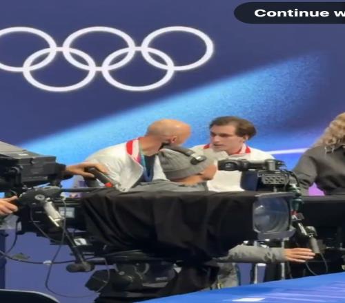 鏡頭切到kiss and cry區(qū)域,這是運(yùn)動(dòng)員完成比賽后,和教練一起坐著等待裁判打分的地方。Beno?t穿著美國(guó)隊(duì)的隊(duì)服,坐在一個(gè)年輕人身邊。