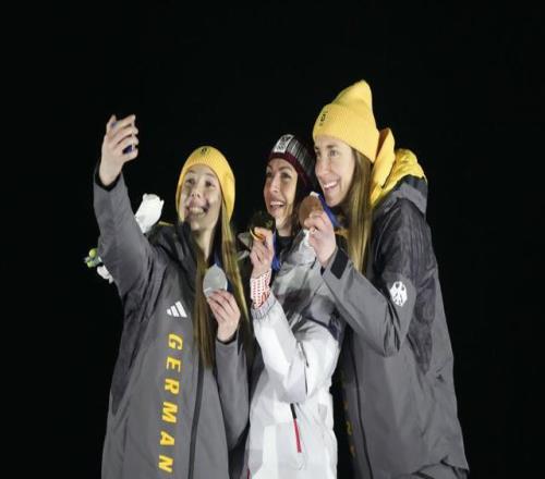 2月14日,冠軍奧地利選手弗洛克(中)、亞軍德國(guó)選手克雷爾(左)、季軍德國(guó)選手普費(fèi)弗在頒獎(jiǎng)儀式上自拍合影。新華社記者 李鋼 攝
