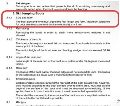 國(guó)際雪聯(lián)(FIS)對(duì)跳臺(tái)滑雪靴子的厚度,高度,楔子,貼合度都有嚴(yán)格的規(guī)定,其中最重要一條: